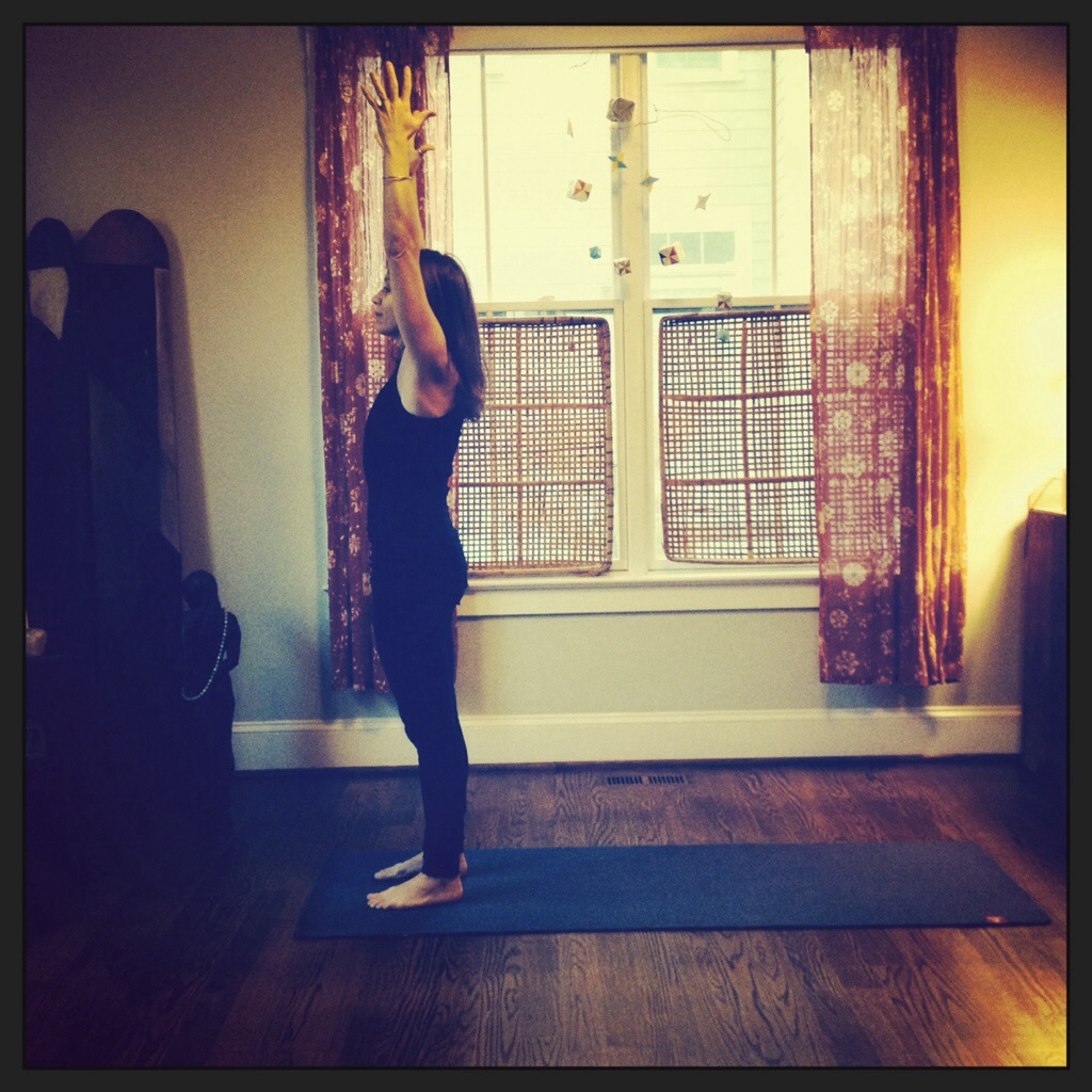 Keep pressing into your feet. Inhale and reach your arms up. Again, anchor tail bone toward the earth and draw lower ribs into your body. Spread your fingers. Keep reaching through your fingertips, and soften the sweet spot where your neck meets your shoulders. Bring your head in line with your spine.