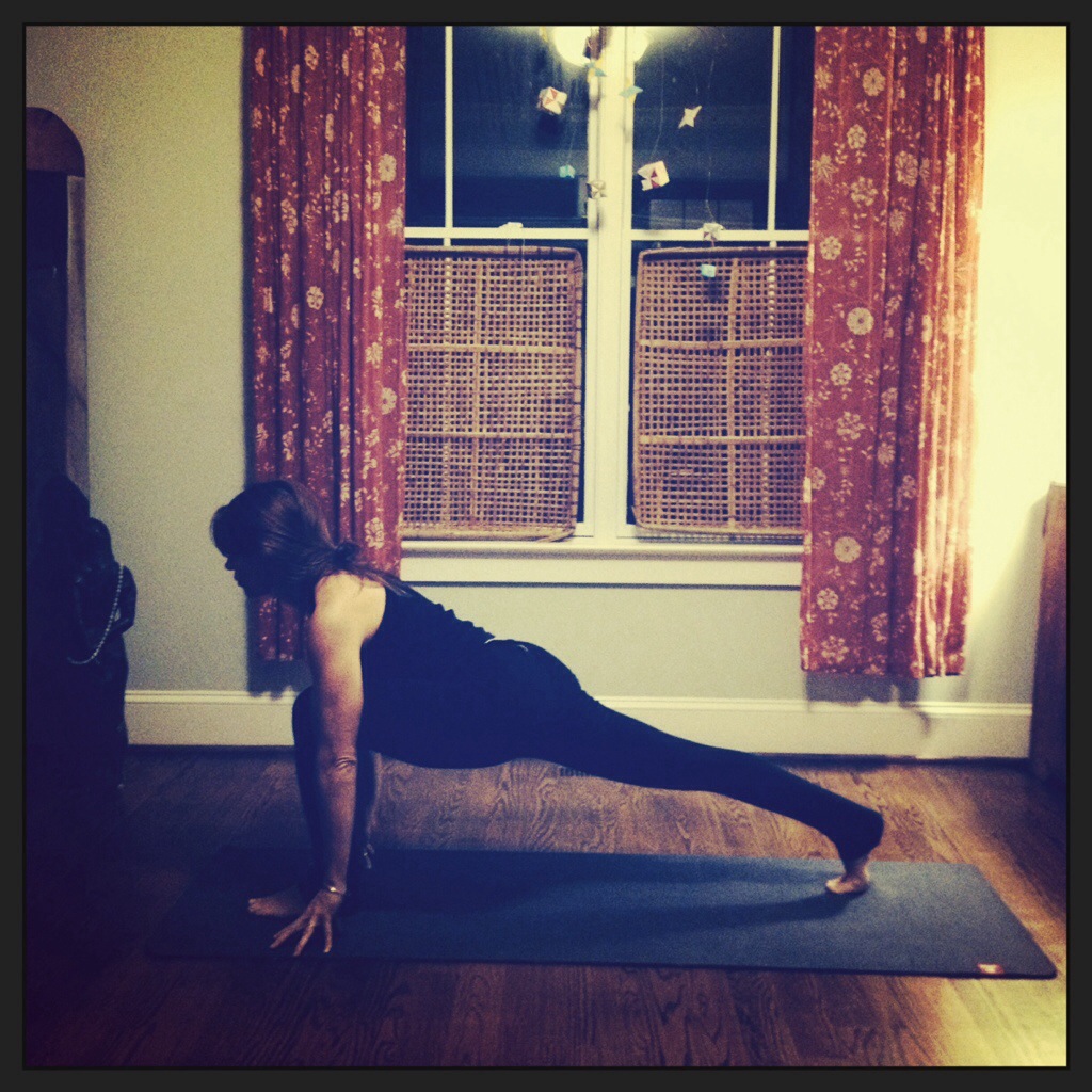 Bending knees, bring hands back down to the floor. Exhale, taking a big step back with your right foot into a lunge. Keep back heel lifted and left knee directly over left ankle, trying to bring left thigh parallel to the earth. (You may need to alter the length of your stance.) Bring your fingertips to either side of your left foot on the floor or on blocks. Hug legs toward each other drawing left hip crease back and settling down into your lunge. Press through your back heel, keeping back leg lifted, straight and strong. Squeeze shoulder blades toward each other, opening your chest. Look forward. Keep breathing here. 3-5 full breaths.