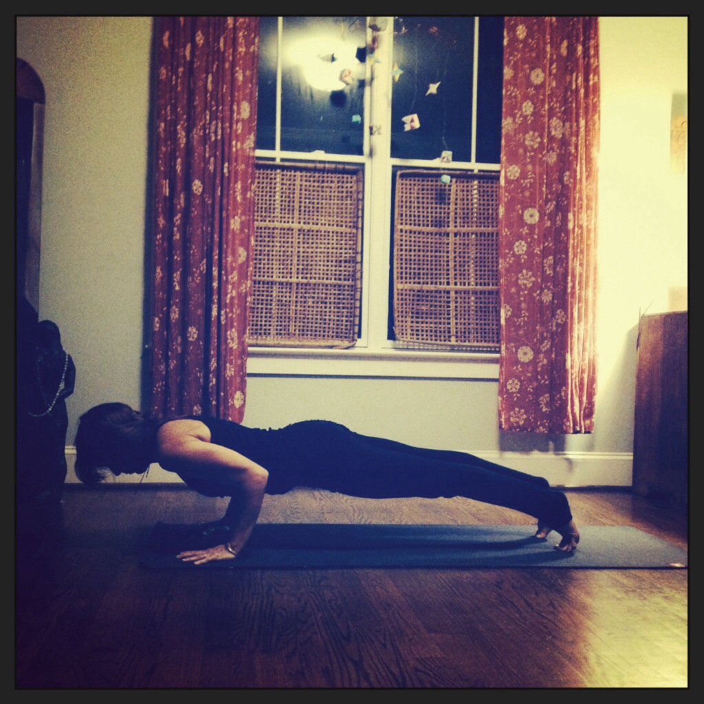 Exhale. Press hands, particularly the mounds of your index fingers, into the earth, hugging forearms toward each other and spiraling your biceps forward. Elbow creases also move forward. Press into your toes, keeping legs straight and strong, and shift more weight into your hands. Keep head in line with spine. Begin to slowly lower down, drawing lower belly up and in, lengthening tail bone toward floor. Imagine that you are pressing your entire back body up toward the sky as you lower. Elbows stay close to your body, pointing straight back. Pause when your upper arm bones are near parallel to the earth, shoulders even with or slightly higher than elbows. Don’t let your shoulders dive down past your elbows. If you lose plank shape in the move, and body becomes more hammock-like, or if your shoulders creep up to your ears, try again with knees lowered to floor, maintaining plank shape between knees and head.