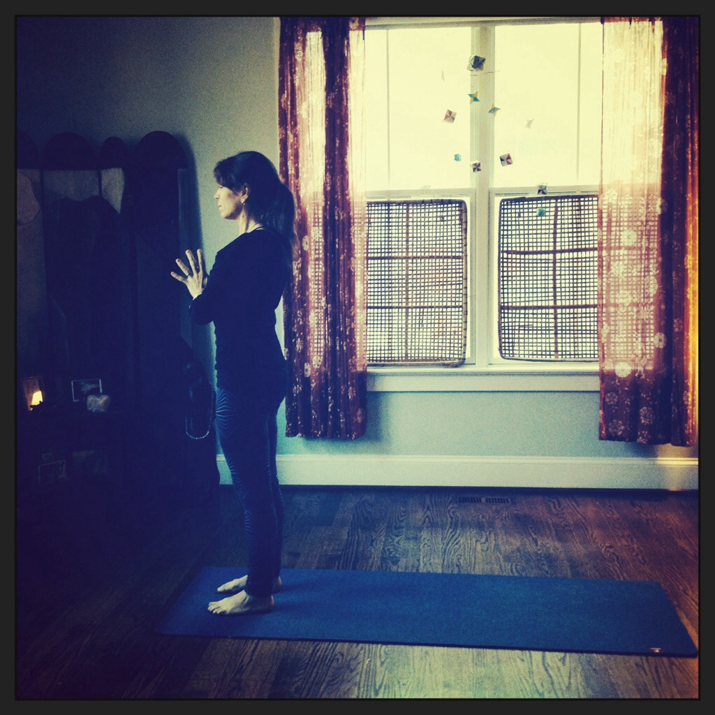 Inhale. Bring your thumbs into your hip creases. Elbows point to the sky. Squeeze elbows toward each other, drawing shoulder blades onto your back. Bring your head in line with your spine. Draw belly in. Bend your knees just slightly, pressing into your feet and rise, long in your spine (not rolling up), all the way back to standing. Reach arms up over head, extending through your fingertips. Bring your hands together, tracing the midline of your body until your hands arrive just in front of your heart. Take elbows wide, pressing your palms gently together, lifting upper chest toward thumbs and softening your shoulders away from your ears. Keep the open quality of your upper body, and draw in your lower ribs and belly. Gaze is forward and soft. Breathe.