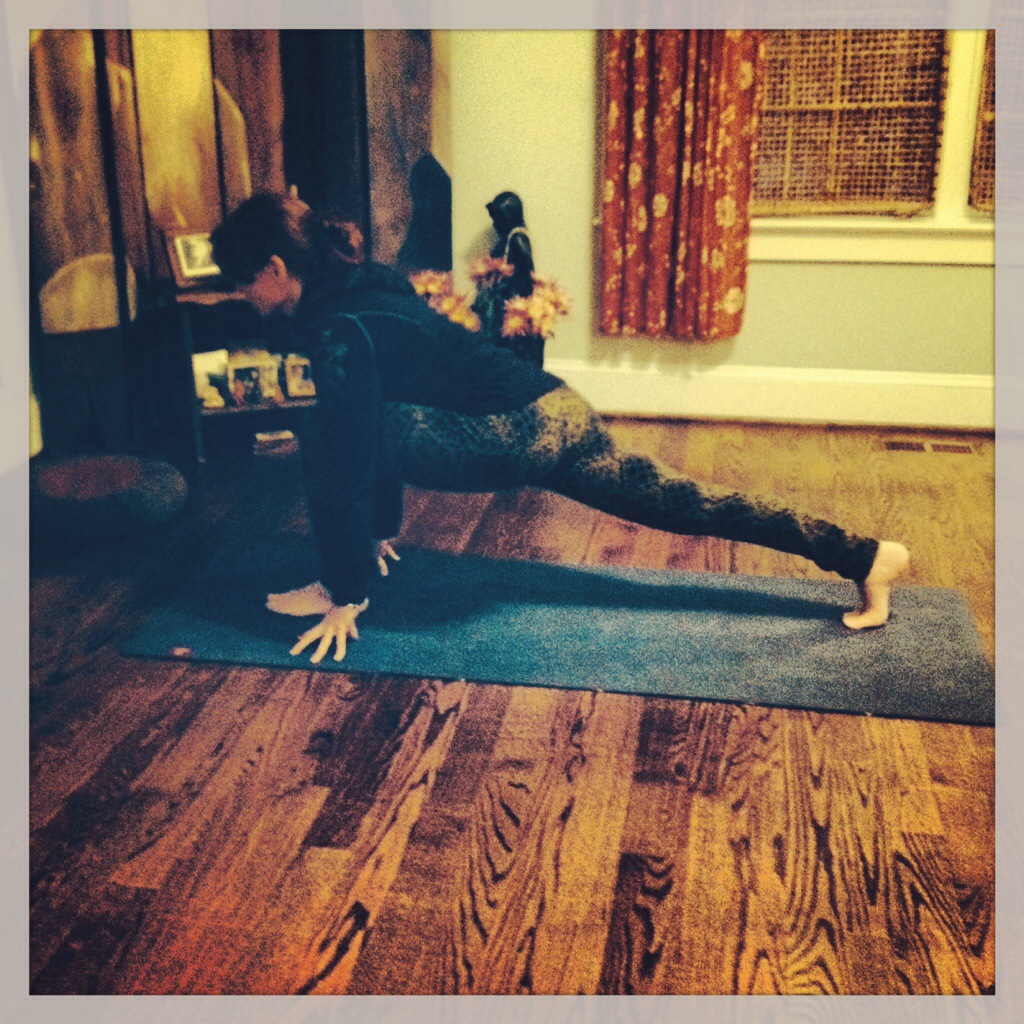 Pose of my day: Lunge. Not into Christmas future. Nor the past. Trying to stay in the present. Front knee over ankle. Settling down, heavy in hips. Pressing through back heel, keeping back leg straight and strong, lifting inner thigh up. Hugging legs toward each other, drawing front hip crease back, squaring hips. Rising onto fingertips and drawing shoulder blades together. Heart lifts, shines forward.