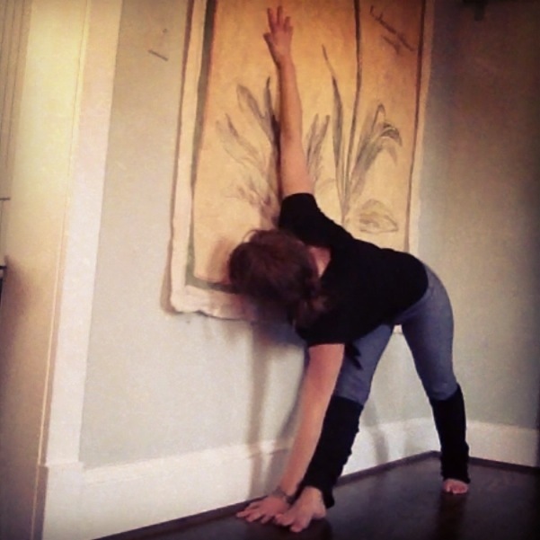 Seeking truce. Of sorts. Working on a pose I dislike. With a little support from my good friend, this great wall, with pretty painting by my beautiful sister, @ccwhittemore. Revolved triangle is a pose I avoid. Among others. But today, life feels good and full of sweetness. Riding those vibes to wrestle with this twisty little demon.