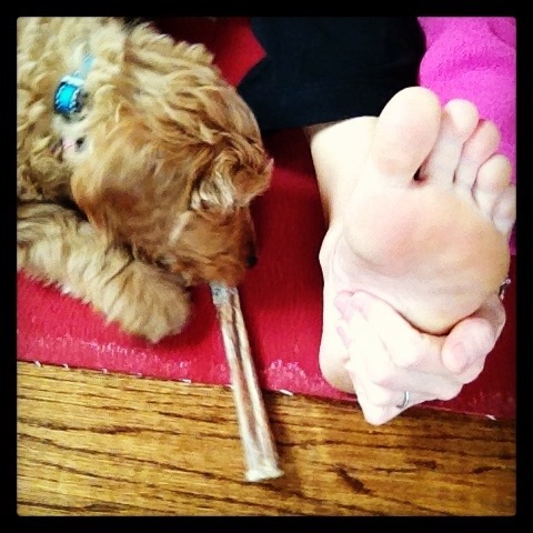 Yoga Nag is still tired. I am still doing most of my yoga rolling around on the floor. But it’s still yoga. And I am still at it. Even with this loveable, tiresome little creature. This small practice brought to you by the bully stick.