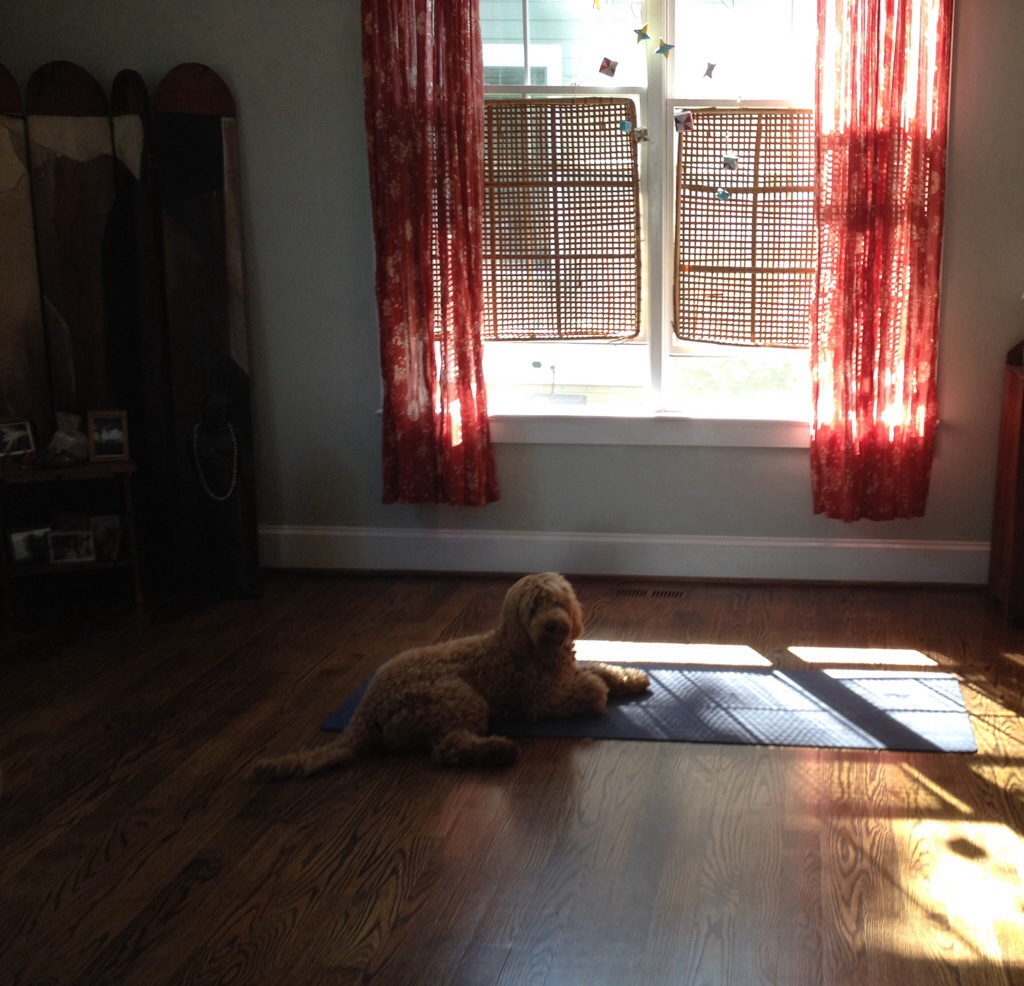 Creating space for yoga at home was an important step for me, for us. Yoga in the kitchen was fine but when we emptied this room, our under-used dining room, practicing at home became much more possible and enjoyable. I know this is a big space. I am grateful every day to claim it. Yours doesn’t have to be this big. But is there a nook in your house you can turn into a practice space? A spot big enough for a mat that is easy to clear or stays clear. It can really help to have a home for your practice.