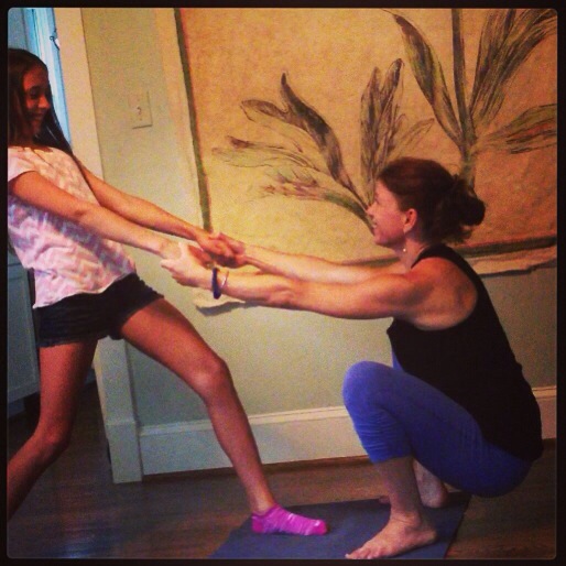Squatting for the mamas. By request, this mid-week, hump day Nag is for you women with your beautiful humps. Practice your yoga, perhaps your squat. Start high, wide legs, thighs working parallel to earth, toes turned out, knees tracking toward 3rd toe, forearms on inner thighs pressing out, knees pressing back, and add a little cat/cow action, just the way we do in class. Then from table position, give yourself a lunge or two on each side. One with back knee down on padded surface, hands on front thigh (can cat/cow here too) and one with back knee lifted, hands on floor, probably on big toe side of foot so there is room for baby. And then find your mama squat, toes turned out, but get down. Squat low. Keeping heels landed on floor or blanket. If you feel wobbly, take your back against a wall. Or butt to stool. Or hold onto door frame and walk your hands down. Or find friend/family member to help hold you, as in this picture. Or, if you feel good, squat on your own, bringing hands palm to palm in front of your heart. Breathe. Feel your mama legs beneath you. And your mama heart beating. Feel your power. Feel your softness. Feel all that you are. Press into your feet, using wall or friend, as necessary, and rise back up to standing. Give your legs and feet a little shake. A little dance. Go mamas!