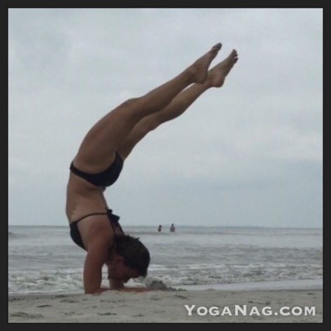 Fun, beach practice toward the scorpion variation of pinchamayurasana. Still working on the balance and the length, and–oh yeah–that “heart melting” before bending those knees. There are many stops along the way in this practice. I usually stop at the vertical variation, but challenged to play around. Beach mindset helps.